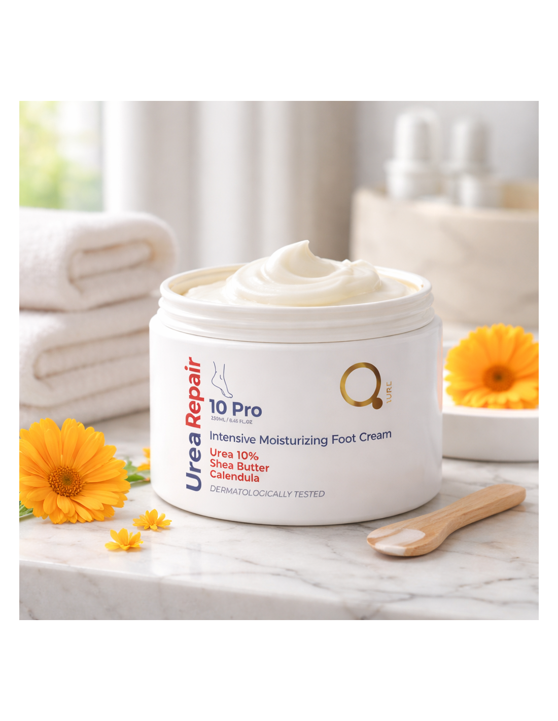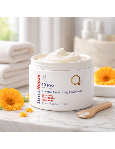 10 % ūreja dziļi mitrina, notur ūdeni ādā, bet šī sviests un kliņģerīšu ekstrakts baro un nomierina ādu.