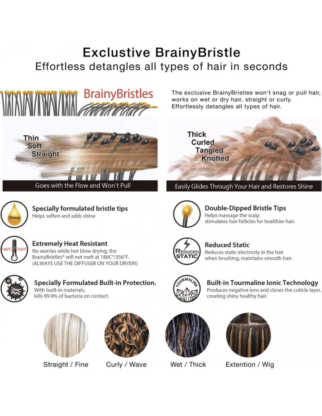 - Piemērots taisniem, cirtainiem matiem, kā arī īpaši piemērots matu pieaudzēšanas un parūku kopšanai.