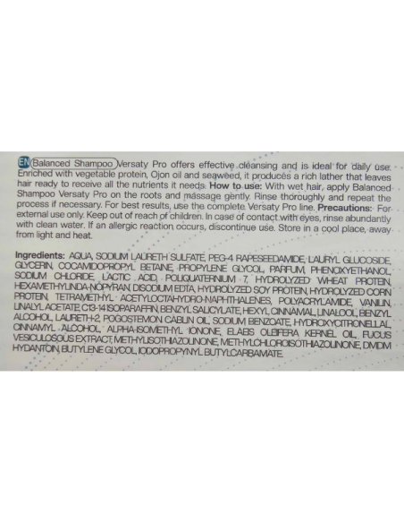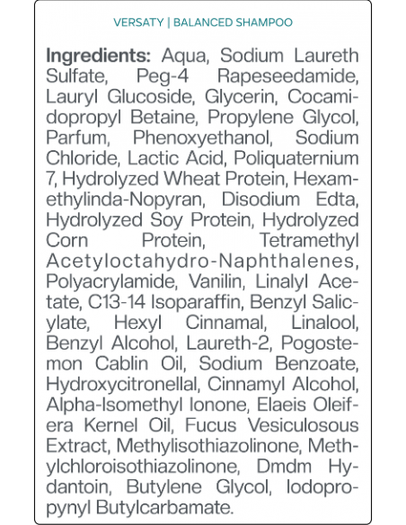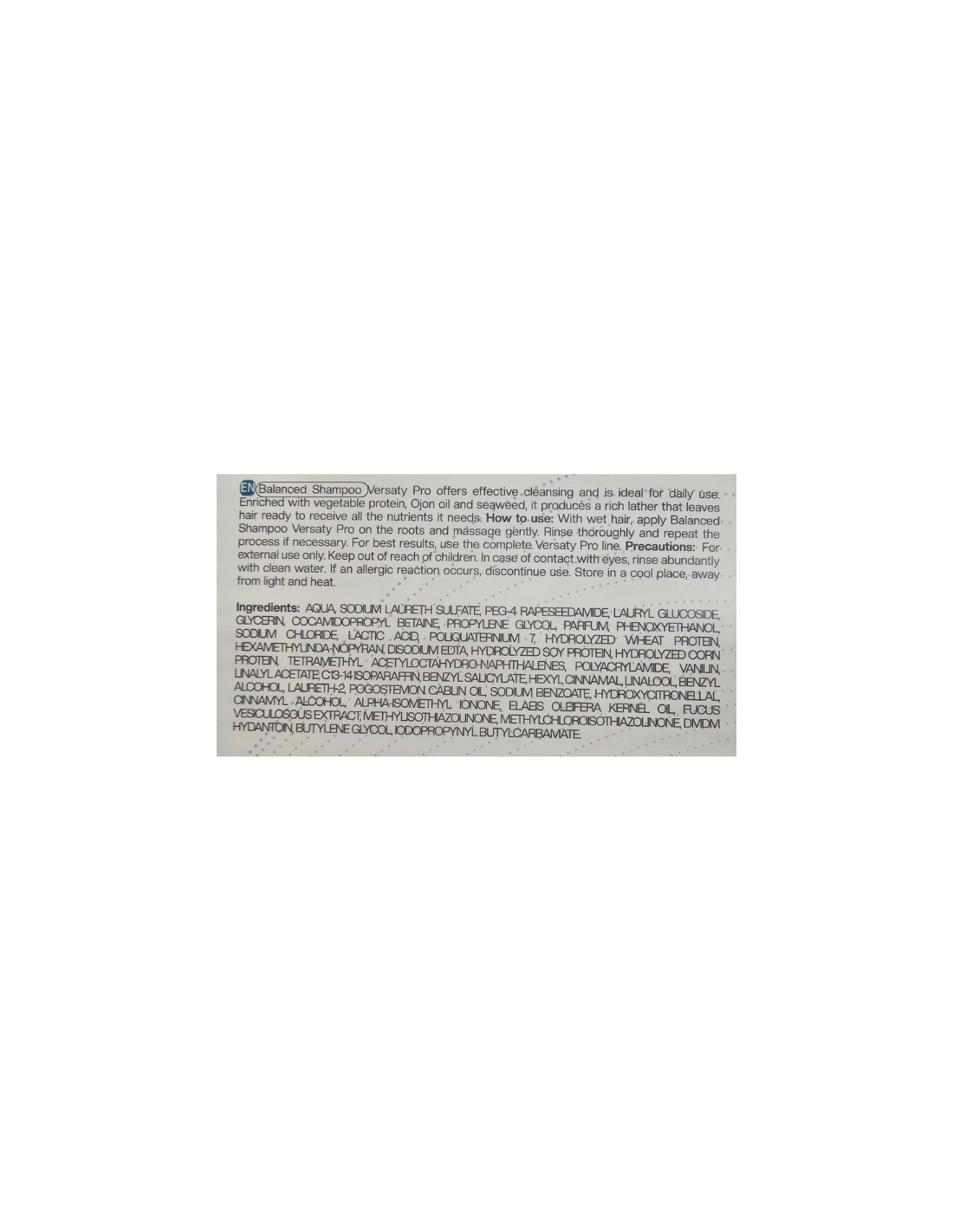 VERSATY PRO sabalansētais ikdienas šampūns un kondicionieris satur: augu proteīnus, ojona augu eļļu, jūraszāļu ekstraktus, pačūlijas eļļu, polikvaterniju-7 un polikvaterniju-10, pienskābi.