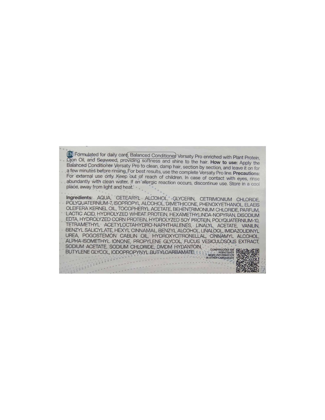 VERSATY PRO sabalansētais ikdienas šampūns un kondicionieris satur: augu proteīnus, ojona augu eļļu, jūraszāļu ekstraktus, pačūlijas eļļu, polikvaterniju-7 un polikvaterniju-10, pienskābi.