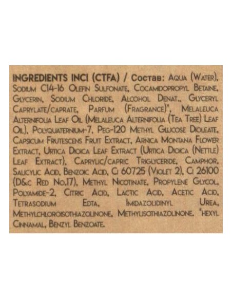SECINĀJUMI. Bagātināts ar tējas koka eļļu, kalnu arniku, sarkanās pākstes augļu ekstraktu, nātres lapu ekstraktu, kamparu.