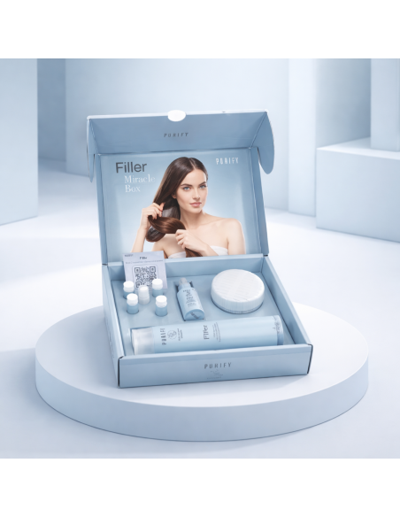 PURIFY FILLER ir profesionāla kosmētisko matu kopšanas līdzekļu līnija trausliem, nolietotiem matiem, kuriem ir nosliece uz lūšanu un lūšanu {piemēram, tos ietekmē balināšanas, gaišināšanas, krāsošanas procedūras un agresīvi produkti}, piešķirot matiem būtisku izturību, elastību, blīvumu un apjomu, cīnoties pret novecošanas pazīmēm ("anti-age" efekts), piepildot matu dziļo struktūru ar ekskluzīvu hialuronskābes un keratīna kompleksu, iedarbojoties pēc nepieredzētas sinerģijas principa.