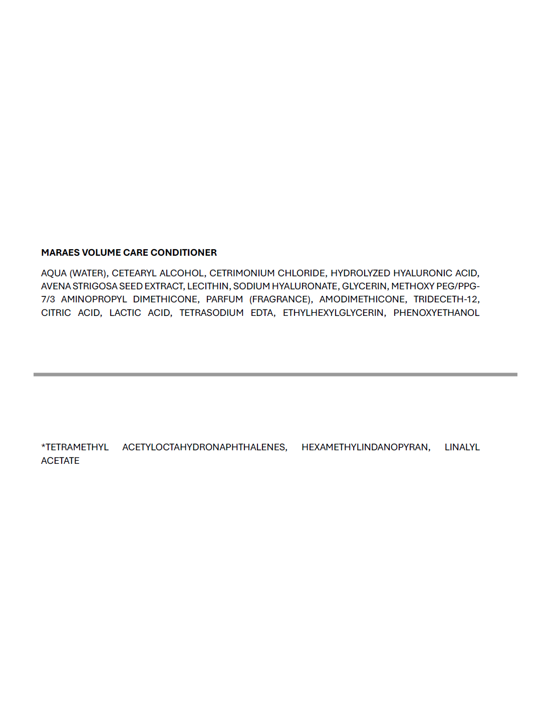 Lietošana: Izmazgājiet matus ar VOLUME CARE šampūnu, nosusiniet ar dvieli, uzklājiet VOLUME CARE kondicionieri, atstājiet iedarboties minūti, noskalojiet ar ūdeni un nosusiniet ar dvieli.