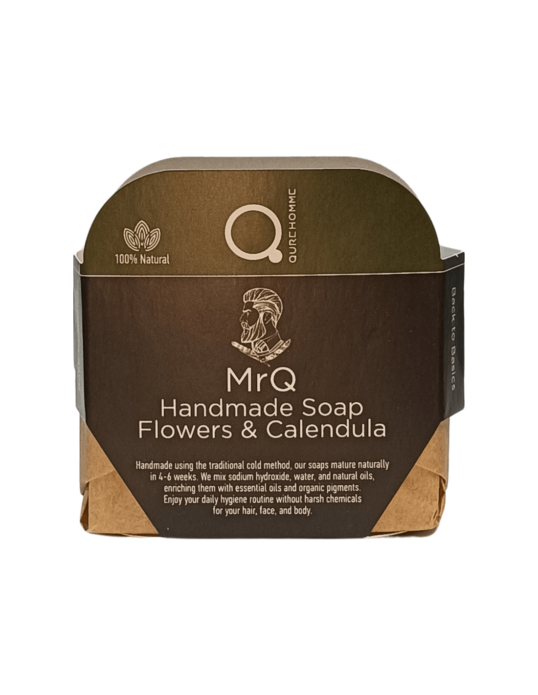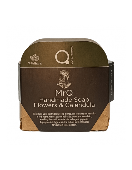 MrQ roku darbs ziepes "Kliņģerīšu ziedi un kliņģerīšu uzlējums" ir dabīgas roku darbs ziepes, kas ir ideāli piemērotas vīriešu ādas ikdienas kopšanai.