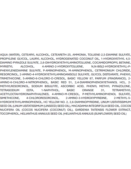 • не содержит: PPD (парафенилендиамин), Лаурилсульфат натрия (SLS), Лаурет сульфат натрия (SLES), Спирт, Минеральное масло.
